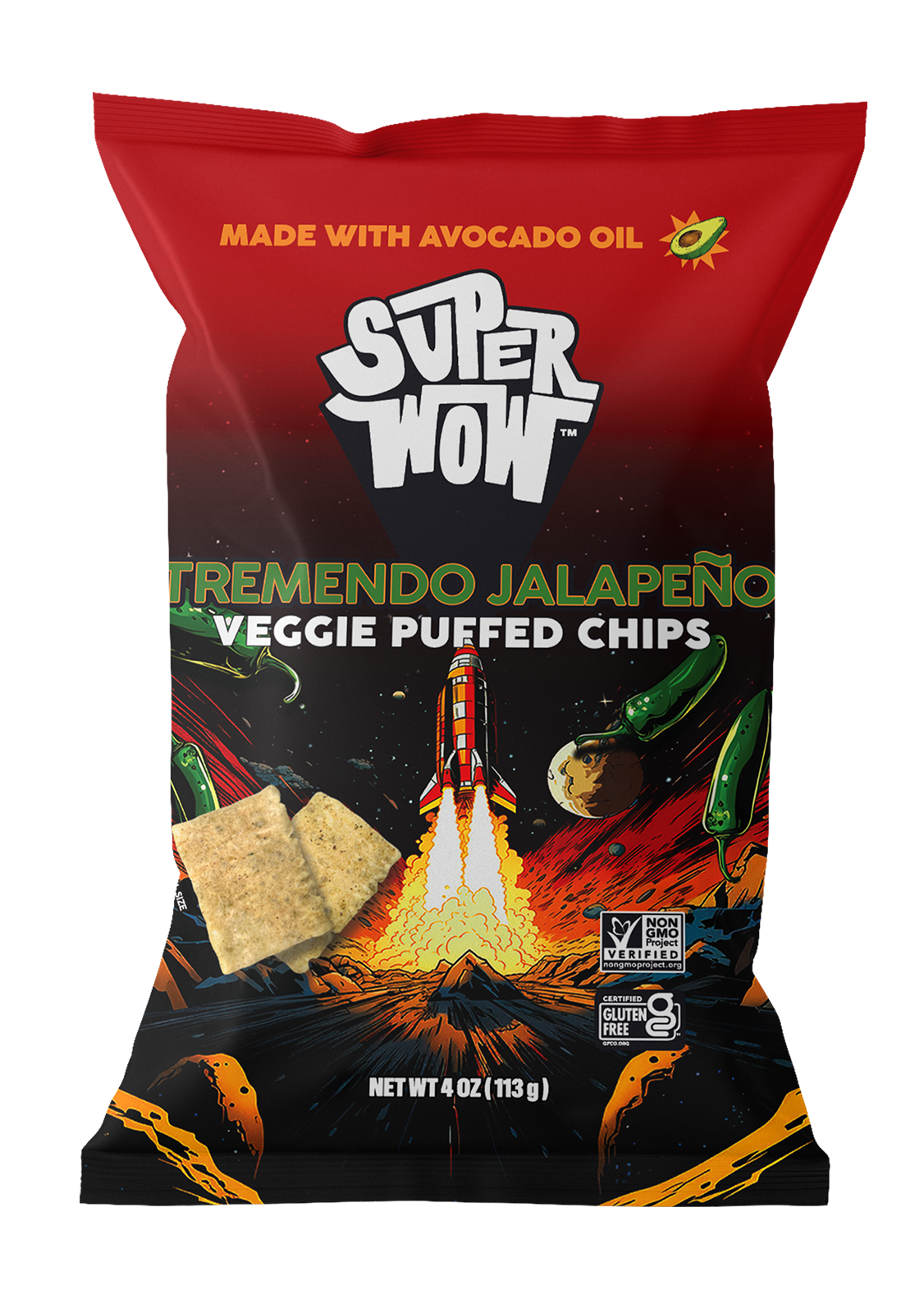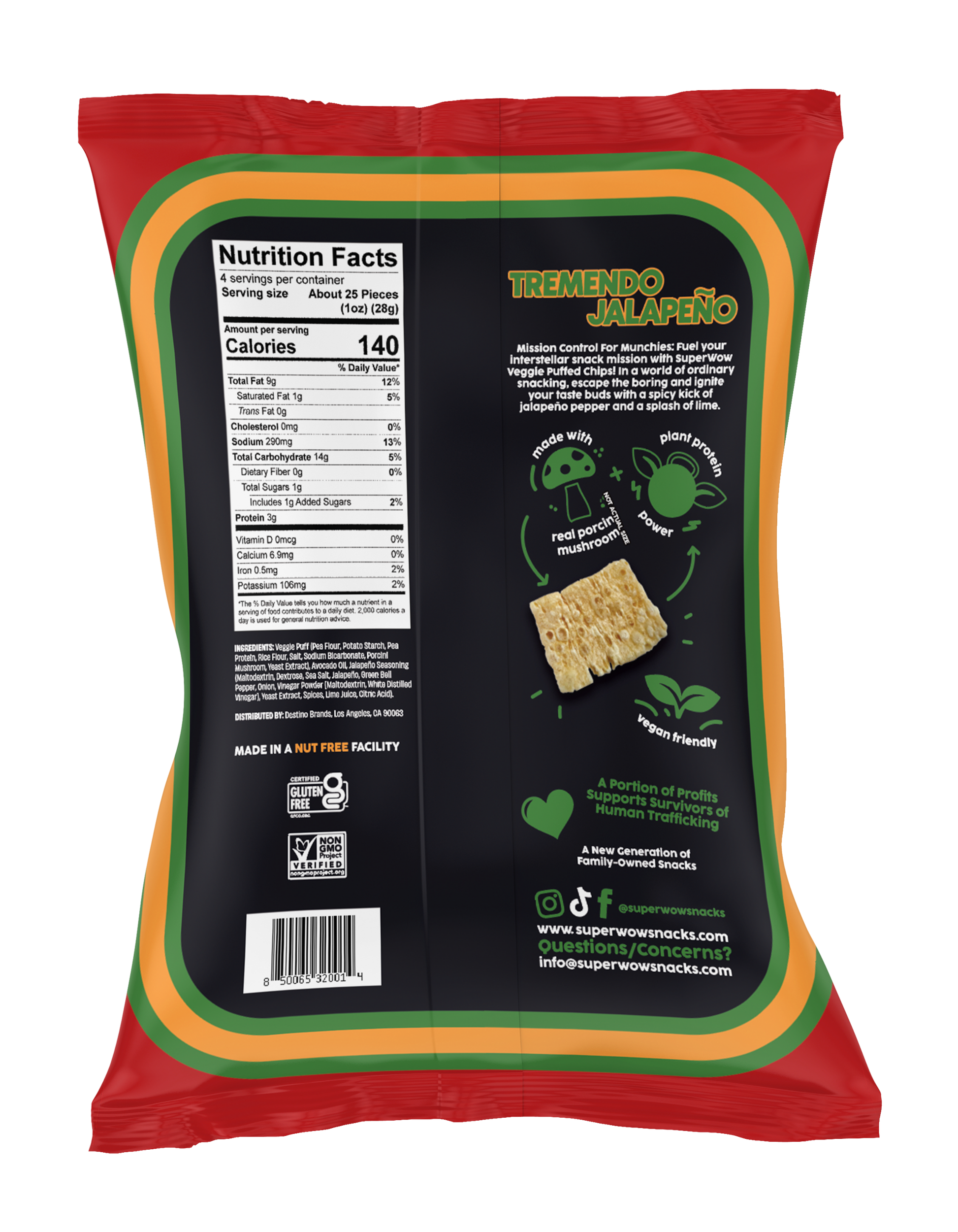 Veggie Puff (Pea Flour, Potato Starch, Pea Protein, Rice Flour, Salt, Sodium Bicarbonate, Porcini Mushroom, Yeast Extract), Avocado Oil, Jalapeno Seasoning (Maltodextrin, Dextrose, Sea Salt, Jalapeno Pepper, Green Bell Pepper Powder, Onion Powder, Garlic Powder, Vinegar Powder [Maltodextrin, White Distilled Vinegar], Yeast Extract, Spices, Lime Juice Powder [Maltodextrin, Lime Juice], Citric Acid).